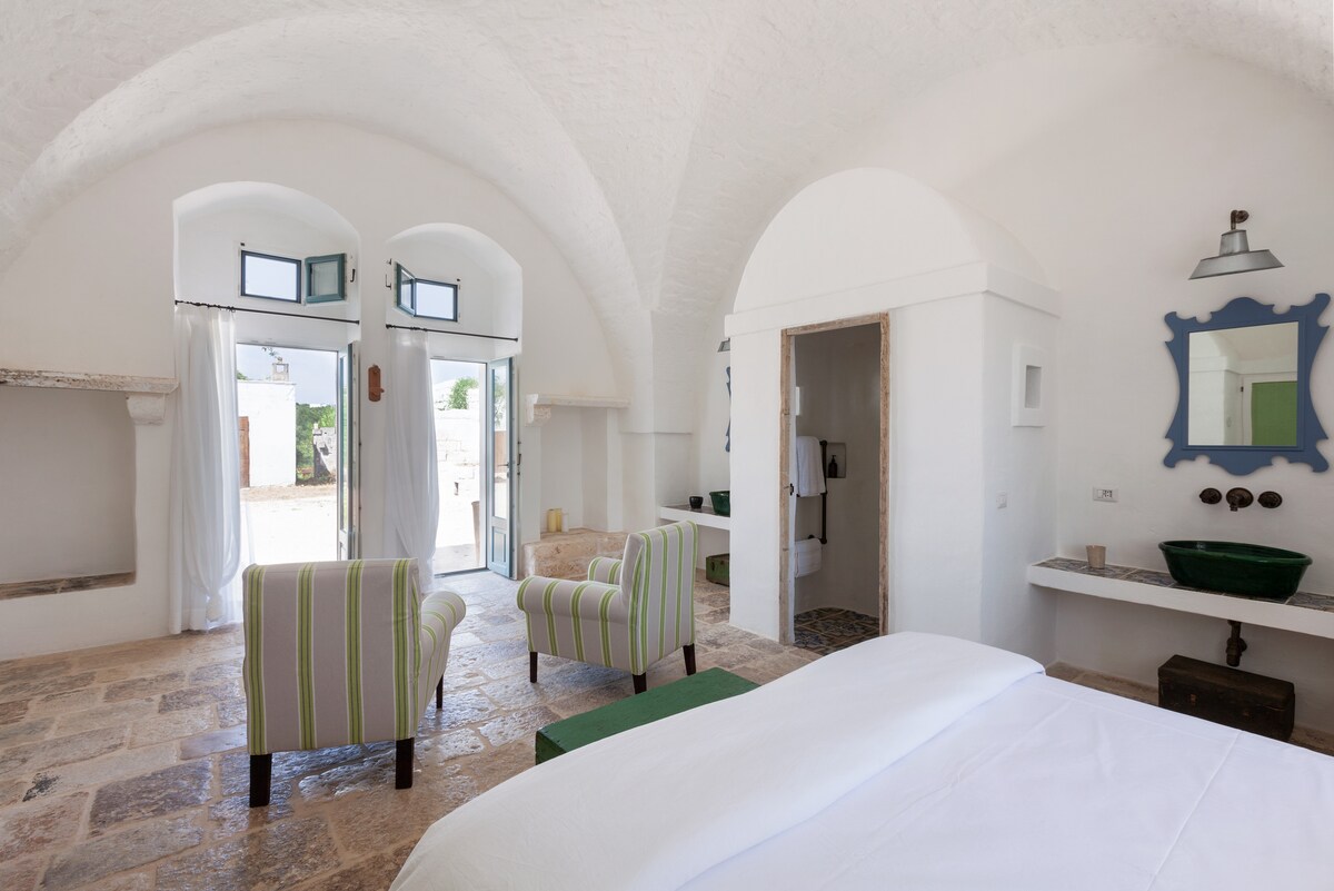 B&B in a 17th-century Masseria, surrounded by 8,500 mq of centuries-old olive groves, just 20 minutes from the beaches of Ostuni. 2 Junior Suites and 2 Suites with direct and independent access from the courtyard. Dazzling white walls, secluded courtyards, arches, stone details, and charming dry-stone walls. Breakfast with organic, locally sourced products: ancient grain bread baked, fruit from our historic orchard, and homemade cakes prepared daily by Patrizia.