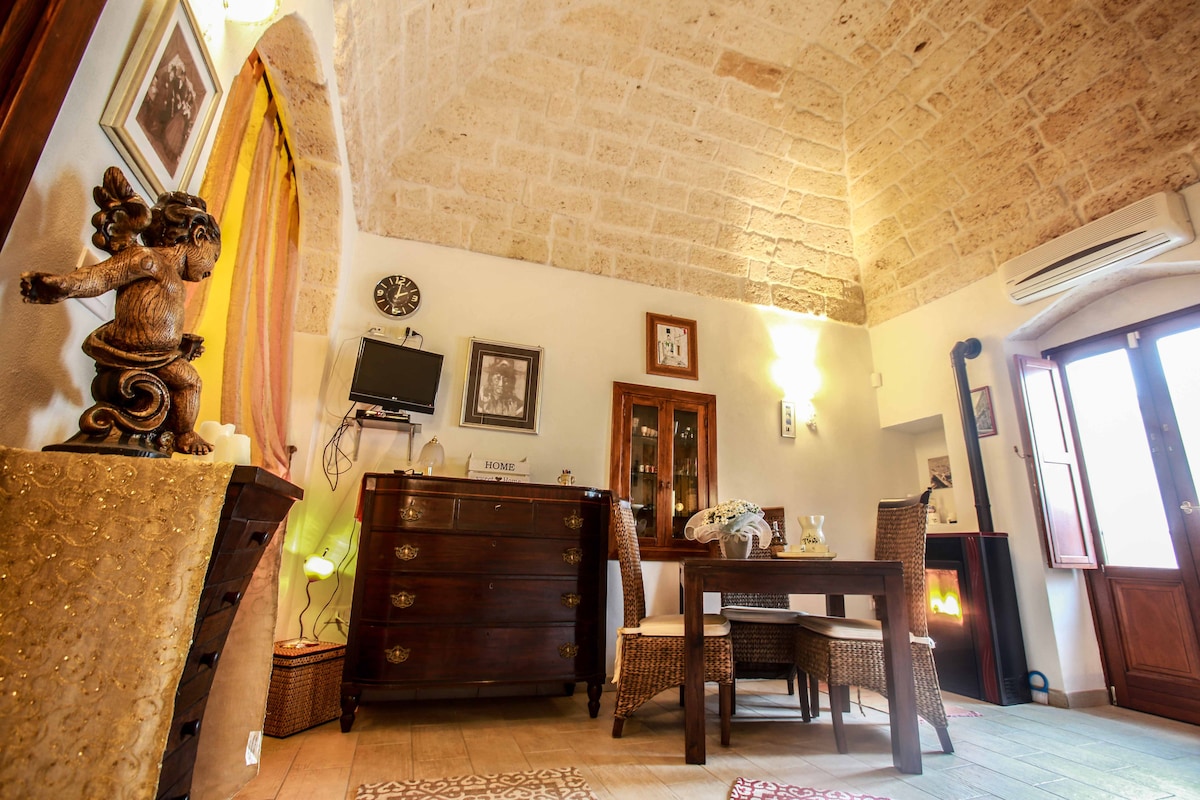 Luxurious and finely restored, located in the heart of the city. Ideal for relaxing and enjoying the archeology and the sea just 10 minutes away. In the living room there is a fireplace and a glass case with a rare piece of ancient history, a road dating back to the early Roman period. An equipped kitchen, a comfortable bathroom, a laundry room with washing machine. A double bedroom and a sofa with the possibility of 3 more seats. An equipped courtyard, the ideal place for relaxing moments.