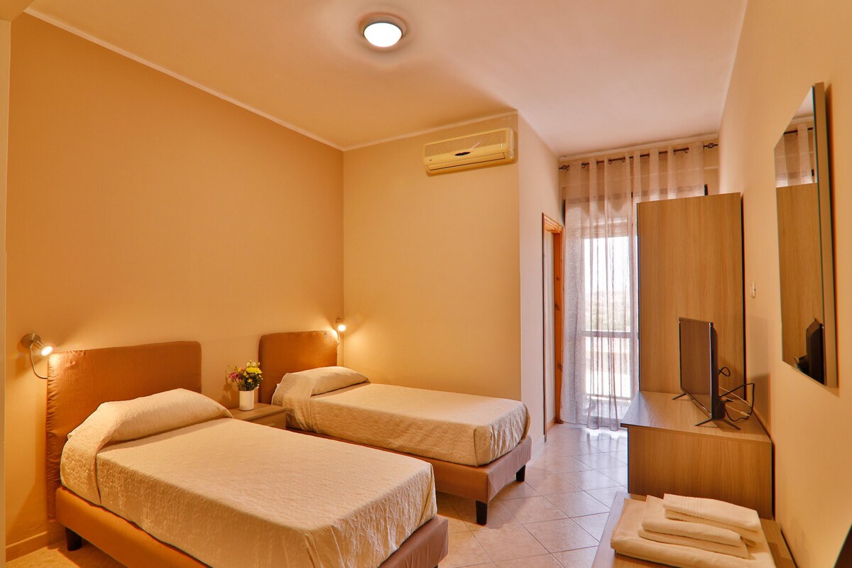 Spaziosa camera matrimoniale/doppia con letti singoli con bagno privato, aria condizionata, connessione WiFi, TV, asciugamani e kit di cortesia. Situata nello stesso stabile della famosissima "Gelateria Enrico" a soli 3 minuti dalla spiaggia e 4 km dal centro storico di Pizzo.