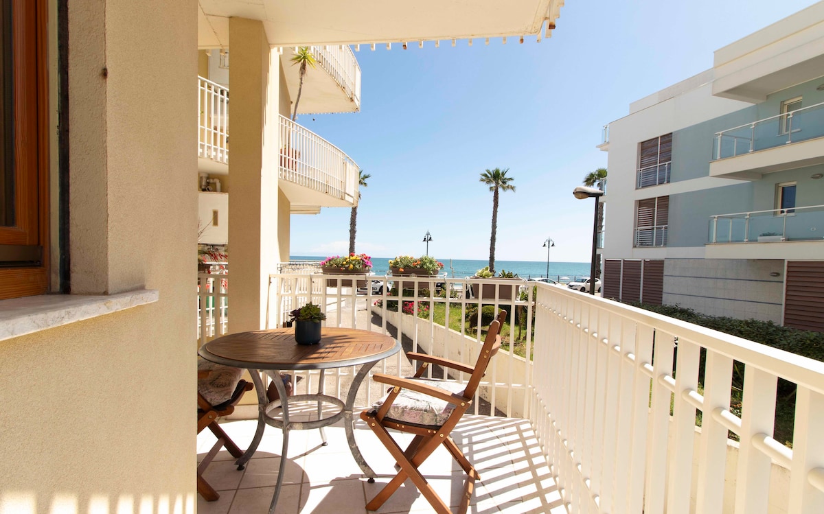 Stupendo appartamento appena ristrutturato vista mare. Composto da due camere da letto con vista, due bagni e grande open space con cucina. L'enorme terrazzo, accessibile sia dalle camere che dalla cucina è attrezzato sia di un salottino sia di un grande tavolo dove è possibile godere di pranzi e cene in assoluto relax direttamente sul mare.
