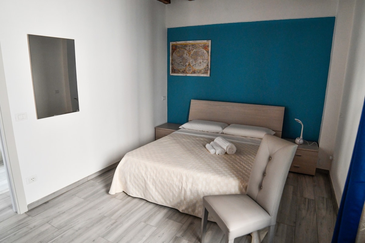Sempre al piano terra è situato il bagno ad uso esclusivo della camera matrimoniale. La camera matrimoniale è situata al primo piano con affaccio sul cortile interno.