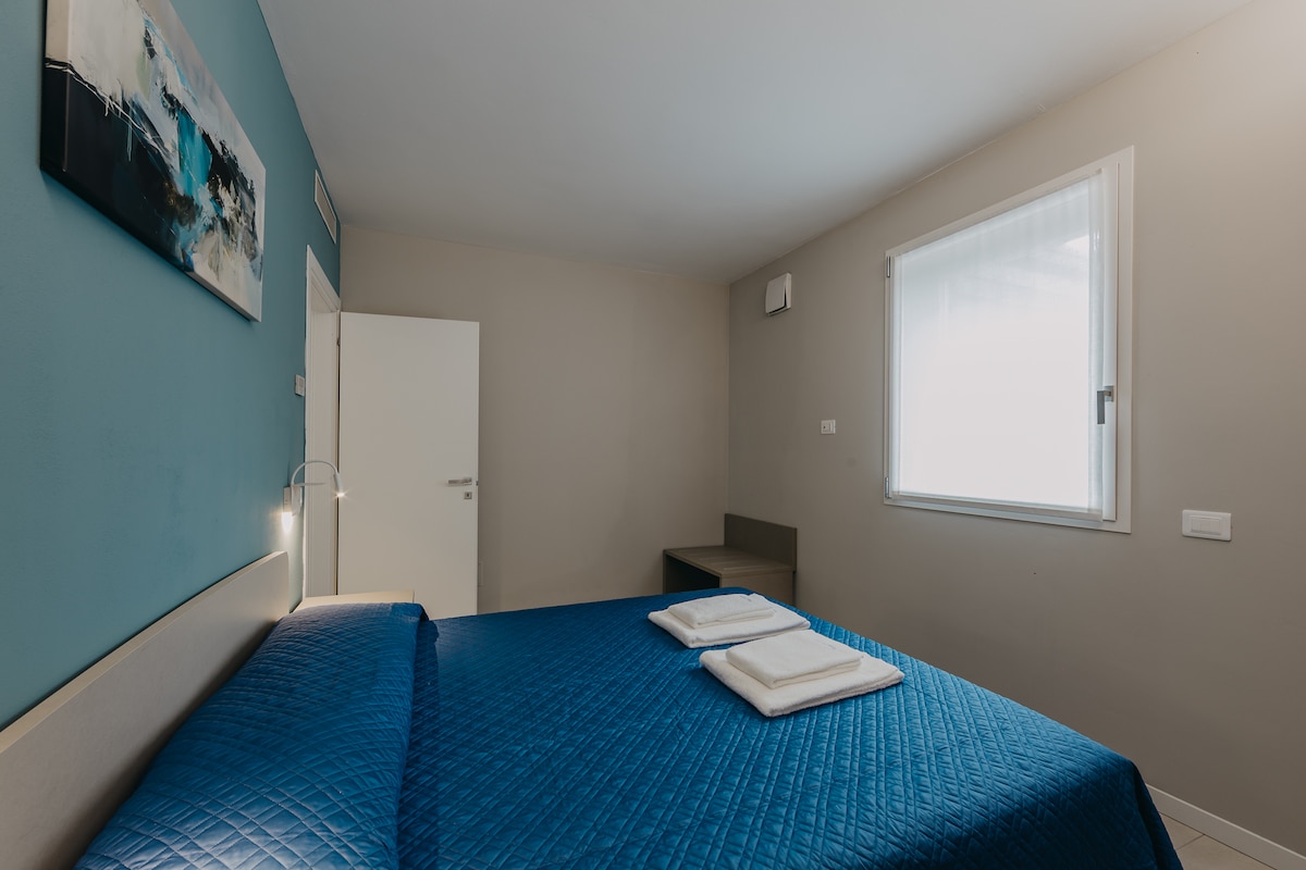 La camera (15 mq) ha un letto matrimoniale ed è fornita anche di una poltrona letto aggiuntiva. E' dotata di ampio armadio, scrivania, tv e aria condizionata. Il bagno è grande (6 mq), fornito di tutti i confort, inclusa una spaziosa doccia. La zona soggiorno (12 mq), oltre al tavolo e alle sedie dove fare colazione o lavorare, ha un angolo lettura e un balcone con vista sul portico interno.
