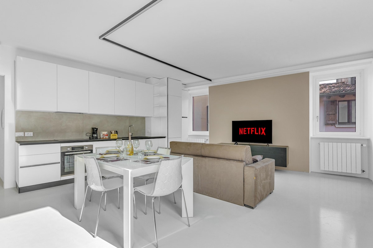 Confortevole e luminoso Monolocale di 45 m² con letto matrimoniale, armadio e nuovo divano letto matrimoniale, smart-tv, connessione wi-fi veloce, comoda cucina a vista dotata di microonde, tavolo e sedie, bollitore, macchina del caffè, lavatrice, frigo+freezer. Acqua potabile. Welcome kit all'arrivo. Ampio bagno con doccia e bidet. Biancheria da letto e da bagno. L'aria condizionata ed il riscaldamento sono autonomi. Ideale per una vacanza nel centro di Desenzano vicino a ristoranti e negozi!