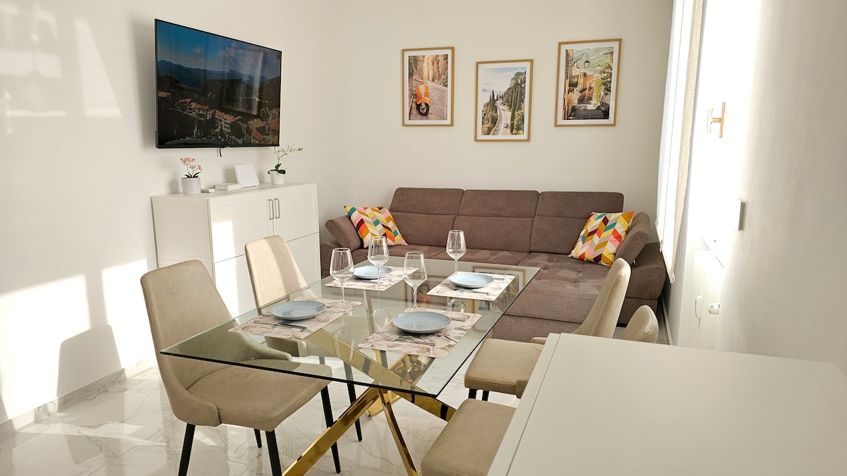 Suitable for 3 adults and One Newborn child who are looking for an oasis of Peace and Tranquility in the city center. In this unique and exclusive place, Borgo Antico Residence, located on Ground Floor, you will find a renovated apartment with individual Air Condition in both rooms, a large terrace with lunch & dinner table. A Private and Covered Parking is available inside the residence for the exclusive use of our guests.