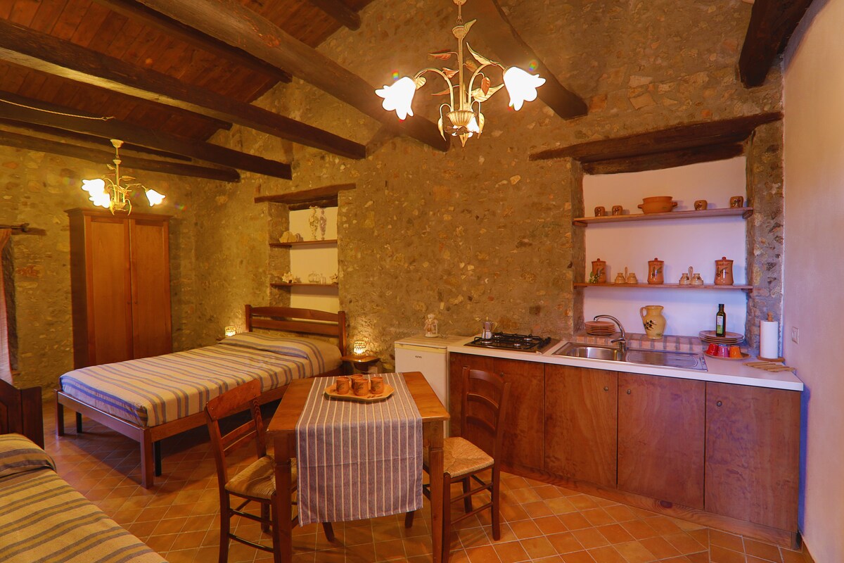 L'appartamento si trova in un antico casolare ristrutturato recentemente in agriturismo, si trova immerso nel verde a pochi passi dal mare. Si sviluppa su due livelli con cucina/soggiorno al piano terra, una camera e bagno al primo piano.