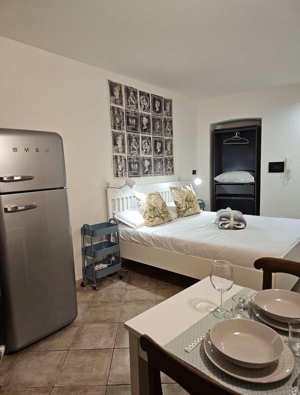 Monolocale, con angolo cottura e bagno completamente ristrutturato. Dotato di tutto i confort: Wi-Fi, Smart Tv 43", aria condizionata, lavatrice, ferro da stiro, frigo con congelatore, macchina per caffè in capsule, bollitore, forno a microonde, piastra a induzione, piatti e stoviglie per cucinare. Prodotti per la colazione, the e caffè. Asciugamani, detergente intimo e docciashampoo. Garage per ricovero di biciclette o moto. In zona ci sono parcheggi gratuiti e tutti i negozi necessari.