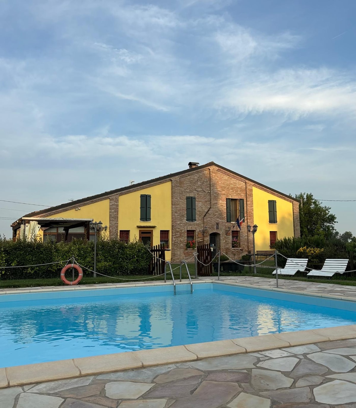 La struttura si trova a Berra (Fe). Gli ospiti, (f.no a 6) hanno a disposizione l'intero piano con bagno e idromassaggio indipendenti (circa 160mq): ingresso, ampio soggiorno, sala da pranzo, una grande cucina e portico arredato con tavolo in legno e barbecue. La zona notte è composta invece, da due camere matrimoniali, alle quali è possibile aggiungere un letto singolo supplementare. Cucina completa di tutto il necessario. Il parcheggio è privato e custodito. 2 bici disponibili su richiesta.