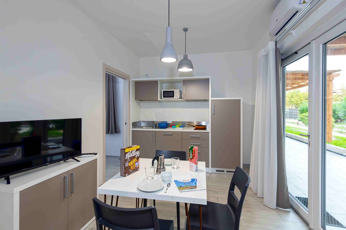 Accoglienti casette in muratura di circa 30 mq con arredamento moderno all'interno del Tahiti Camping Village. Ideali per una vacanza pratica, offrono un soggiorno con angolo cottura, dotato di lavello, piano cottura a induzione, microonde, frigorifero e lavastoviglie. La zona notte dispone di una graziosa camera con letto matrimoniale , mentre il bagno interno è ampio e completo di bidet. Scegli la soluzione ideale per la tua famiglia e prenota ora per un'esperienza indimenticabile!