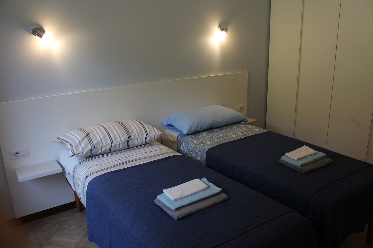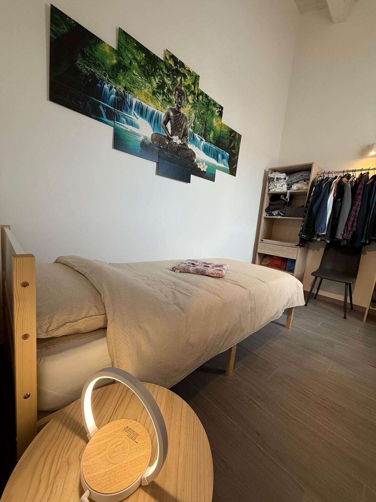 Stanza mansardata, ampia e tranquilla con bagno privato. Non è indipendente, si accede dall'ingresso posteriore di casa mia. Dispone di letto matrimoniale, letto a una piazza e 1/2, aria condizionata, tavolo, frigorifero, microonde, bollitore. Non ha cucina e non ha balcone. Fornisco io : lenzuola, asciugamani, shampoo e prodotti per la prima colazione. La cucina non è disponibile. È richiesto all'arrivo un contributo pulizie da 10,00 euro a 30,00 euro in base alla durata del soggiorno.