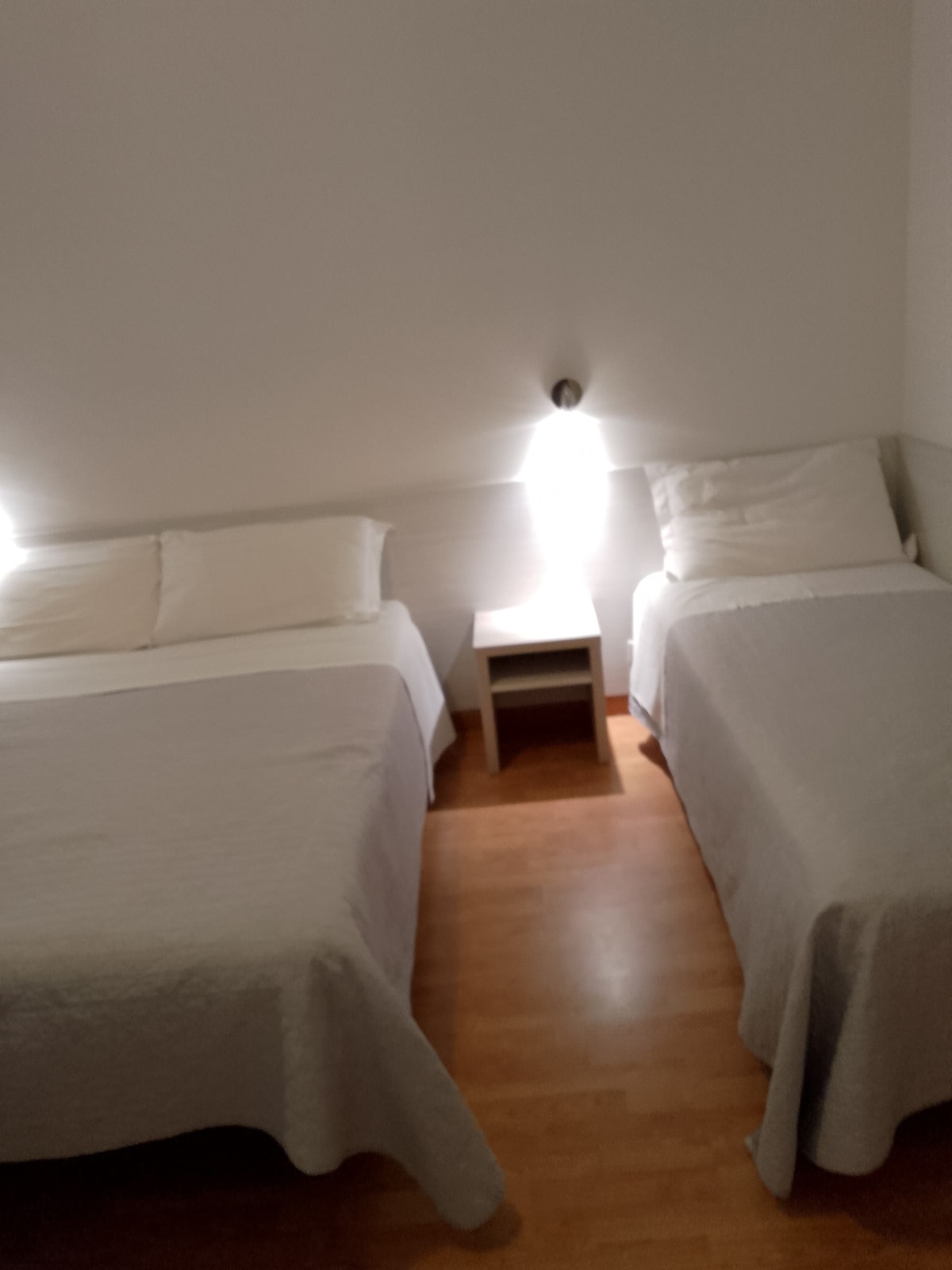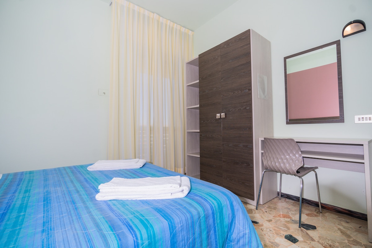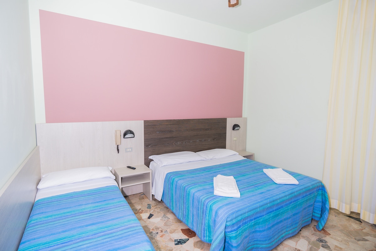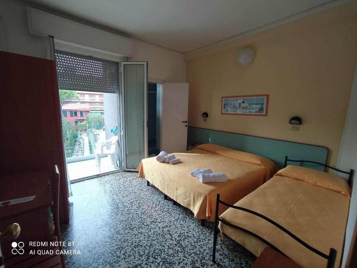 Quadruple room with balcony (double bed + bunk bed), private bathroom. Central air conditioning, safe, TV, hairdryer, and Wi-Fi. Comfortable double bed and bunk bed. Parking next to the hotel costs €8.00 per night. You can stay with your four-legged friend for an additional €10.00 per night. The tourist tax is €1.50 per night per person (children excluded).