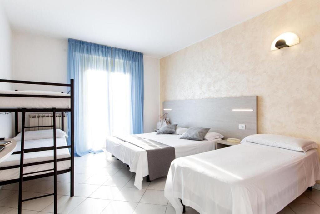 Quadruple room with balcony (double bed + bunk bed), private bathroom. Central air conditioning, safe, TV, hairdryer, and Wi-Fi. Comfortable double bed and bunk bed. Parking next to the hotel costs €8.00 per night. You can stay with your four-legged friend for an additional €10.00 per night. The tourist tax is €1.50 per night per person (children excluded).