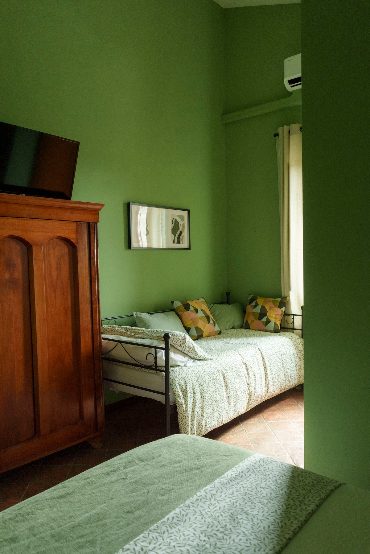 Una soluzione accogliente per piccoli gruppi o famiglie: la nostra camera tripla offre un letto matrimoniale e un letto singolo in un ambiente luminoso e raffinato. Goditi la tranquillità della campagna con tutti i comfort: bagno privato, aria condizionata, TV, minibar e colazione inclusa.