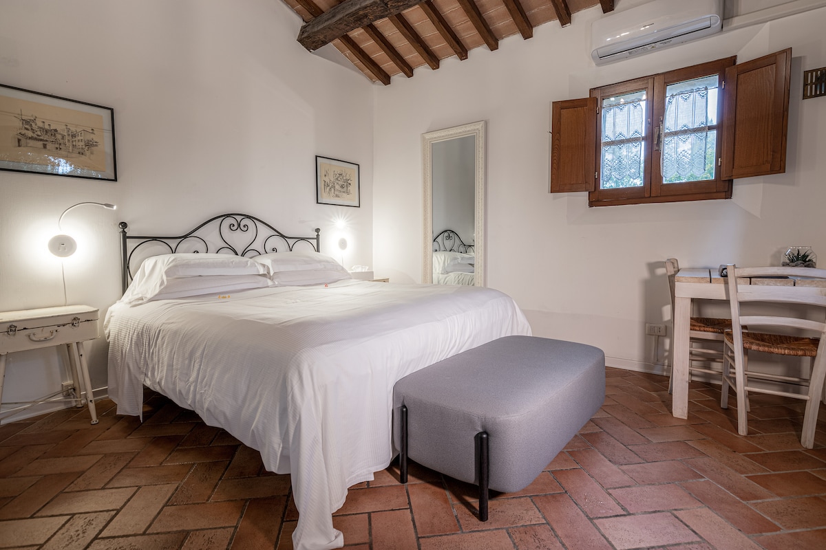 La Camera Matrimoniale Superior, situata nel complesso settecentesco Le Piazze, offre 30 mq di comfort. Con una camera matrimoniale, bagno privato e un’area esterna ideale per il relax, è perfetta per coppie o viaggiatori singoli. Dotata di aria condizionata, TV, minibar e macchina per caffè espresso, garantisce un soggiorno tranquillo e raffinato immersi nella bellezza della campagna toscana.