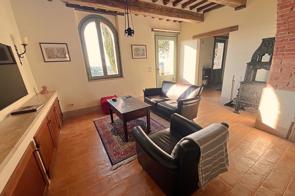 The house enjoys a rare and enchanting view of the Val d’Orcia and Monte Amiata, ensuring maximum privacy. The interiors mirror the charm of the Tuscan style, with antique furniture and finishes made by local artisans. It is equipped with a double bedroom, a large living room with a big table, a fully equipped kitchenette, a double sofa bed in front of the fireplace, in the living room. Outside, the patio will allow you to eat with the colors of the sunset as a backdrop.