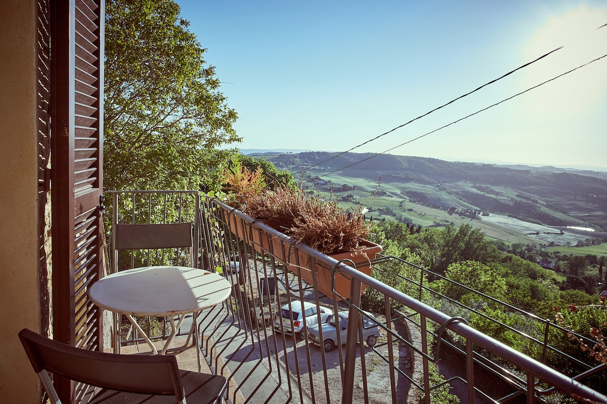 Huge and charming top floor apt in Tuscan Villa with breathtaking view! Visit Montepulciano, Pienza, Siena, explore country side, vineyards and hot springs, hiking or e-biking, strolling or driving! Two roomy suites with top quality beds and bathroom ensuite. Windows walled living room, comfy sofas, professional kitchen at your own use. We can set Winery visit & tasting, Cooking classes and private dinners. NEW Hot tub facing green hilltop! ExperienceTuscany as a local, with your local Host!