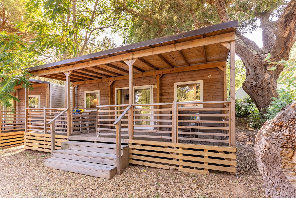 Animali non ammessi. 34 mq di dimensione, 1 camera da letto matrimoniale, 2 camere con letti singoli. Soggiorno con angolo cottura attrezzato di stoviglie e divano. Frigorifero con congelatore - Forno a microonde - TV 32 HD. Aria Condizionata/Riscaldamento, 2 Bagni con wc, lavabo e box doccia (di cui uno nella camera matrimoniale), phon. Veranda esterna in legno coperta dotata di cancelletto di sicurezza. Tavolo e sedie da giardino per il relax in veranda.