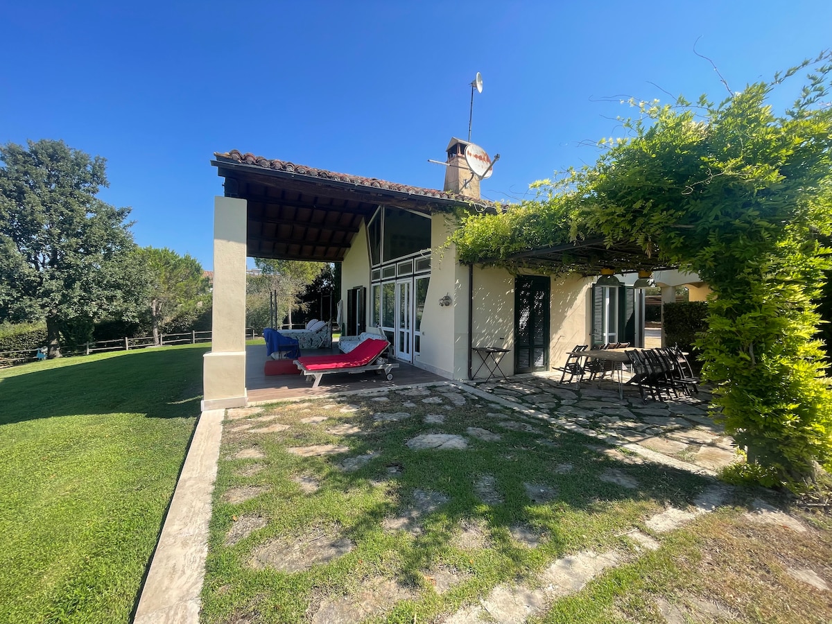 Villa in pietra con particolari rifiniture architettoniche immersa in un bosco di castagni. Un grande giardino, in parte pavimentato a pietra, correda la proprietà dal quale si può ammirare un panorama meraviglioso della maremma toscana. Immersi nella natura si nota da una parte il mare con il golfo di Follonica, l'isola d'Elba e la Corsica, dall'altra l'isola del Giglio. E' possibile fare lunghe passeggiate nella natura o raggiungere località balneari o città d'arte.