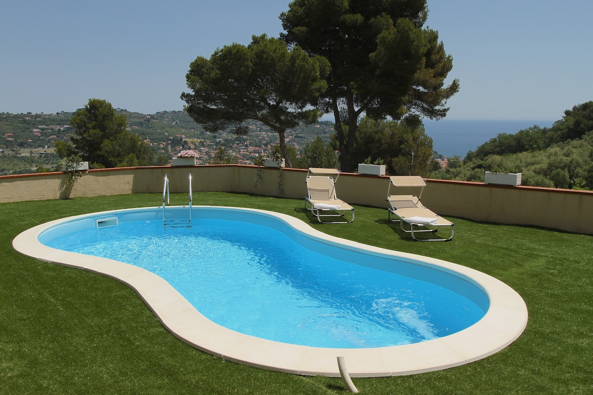 Trilocale Libeccio70m2,piano terra,villetta indipendente,giardino privato,siepi,ulivi secolari,a 6 min dal mare,a 1 km da autostrada,a 15 min dalla Costa Azzurra e da Sanremo.2Camere da letto matrimoniali,1bagno con doccia,bidet,wc,lavabo,lavatrice,open space con divano letto matrimoniale,cucina attrezzata,lavastoviglie,forno,microonde,macchina caffè con cialde.Piscina,idromassaggio,cucina estiva.Citybikeselettrichegratis.Cambio settiman.biancheria,servizio pulizie.Tv Wi-Fi.Parcheggio privato.