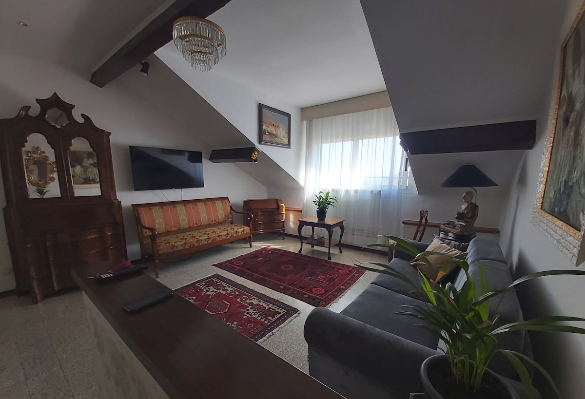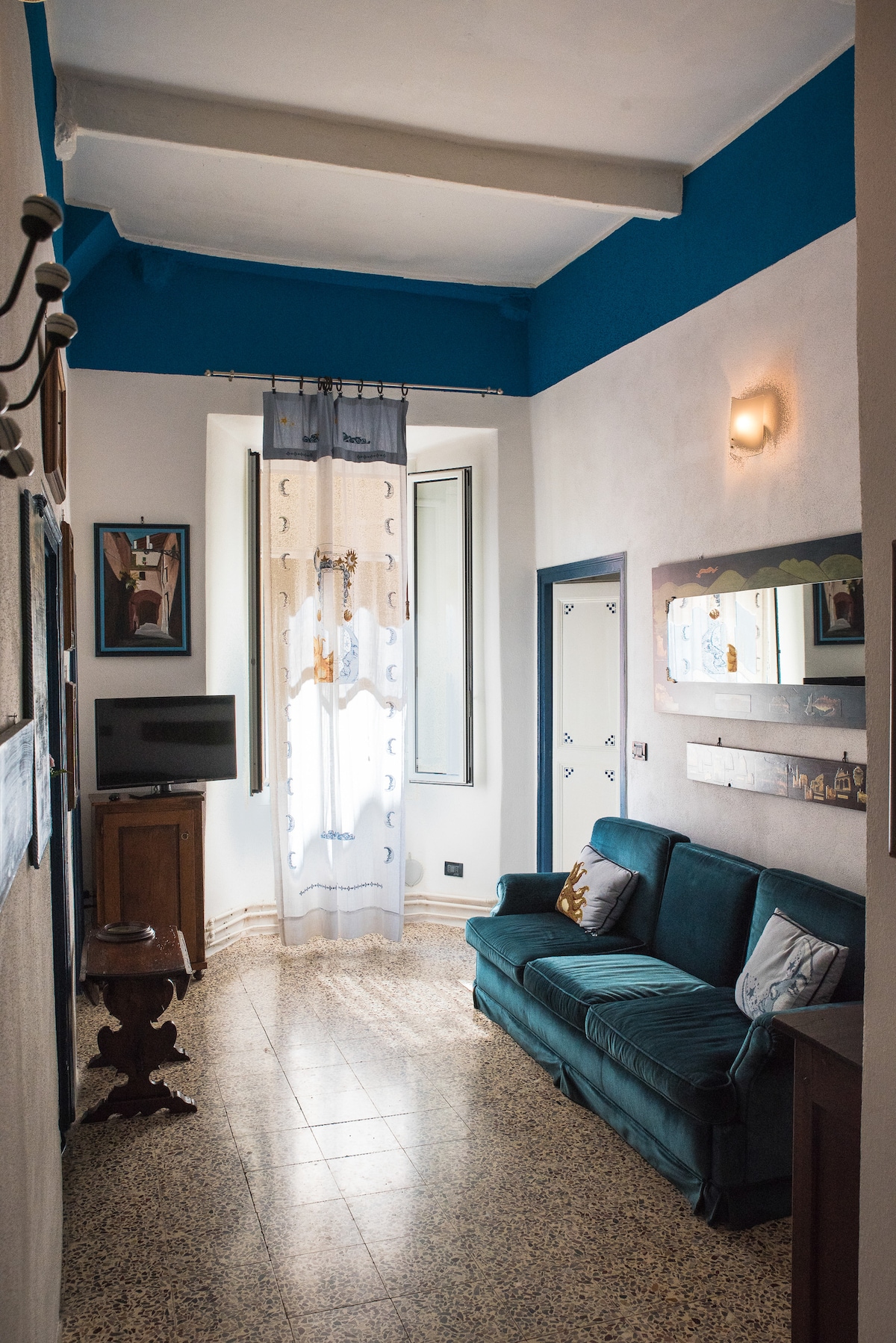 In palazzo settecentesco nel "Parasio" di Porto Maurizio, quartiere storico affacciato sul mare, appartamento di ampia metratura disposto su due livelli, silenzioso, accogliente e con vista sul porto turistico e sulla città. Si trova a poca distanza dalle spiagge di sabbia della "Marina" e del "Prino", raggiungibili a piedi in 5 minuti percorrendo scalinate panoramiche o con gli ascensori pubblici gratuiti (con fermata a 20 metri dal portone d'ingresso)