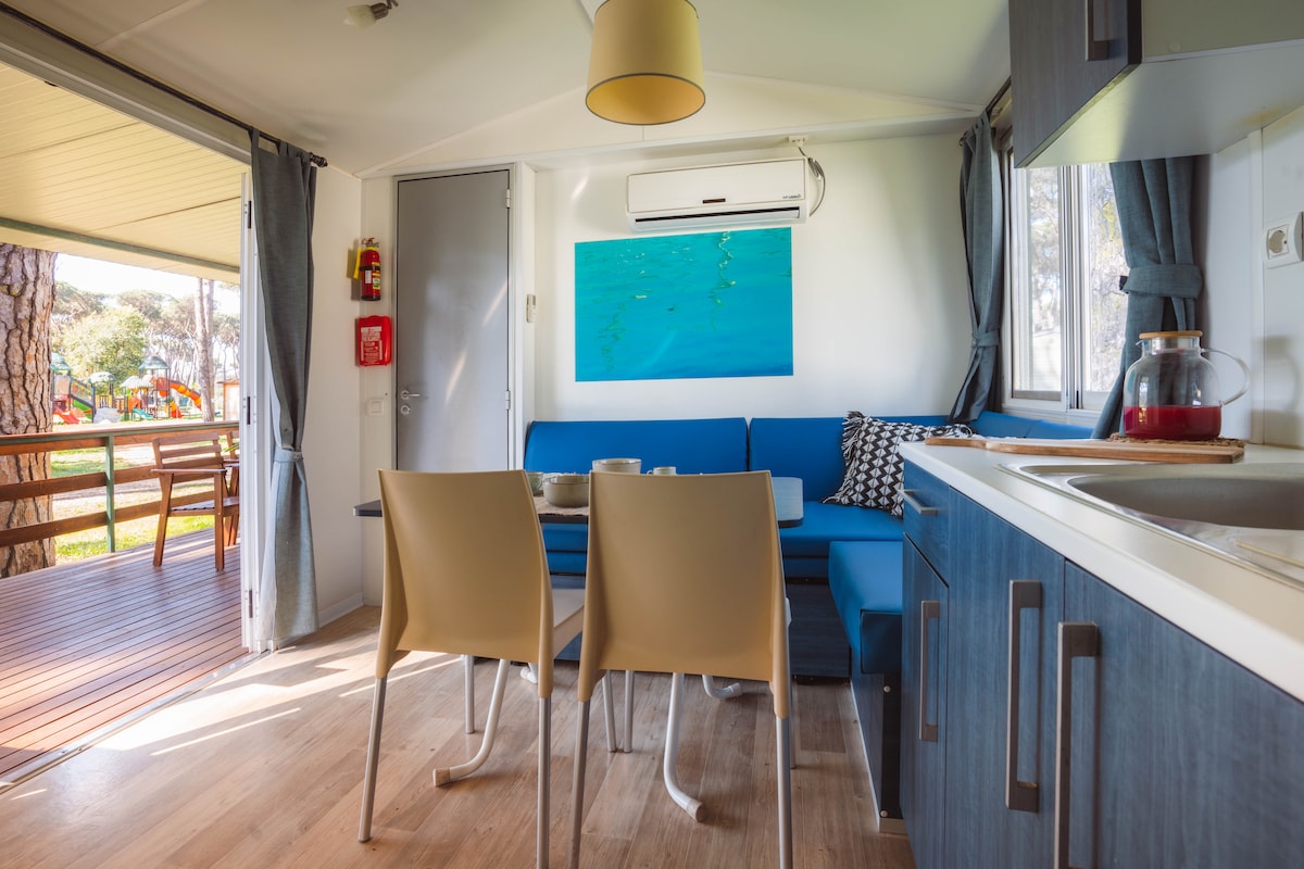 Vivi l’esperienza di svegliarti in un alloggio immerso nella natura. E’ l'ideale per le famiglie fino a cinque persone. Climatizzato con cinque posti letto, disposti tra camera matrimoniale e una camera con tre letti singoli di cui uno a scomparsa. Composto da una veranda completamente in legno con tavolo esterno, due camere, un salone con divano, cucina, tavolo da pranzo e bagno con ampia doccia.