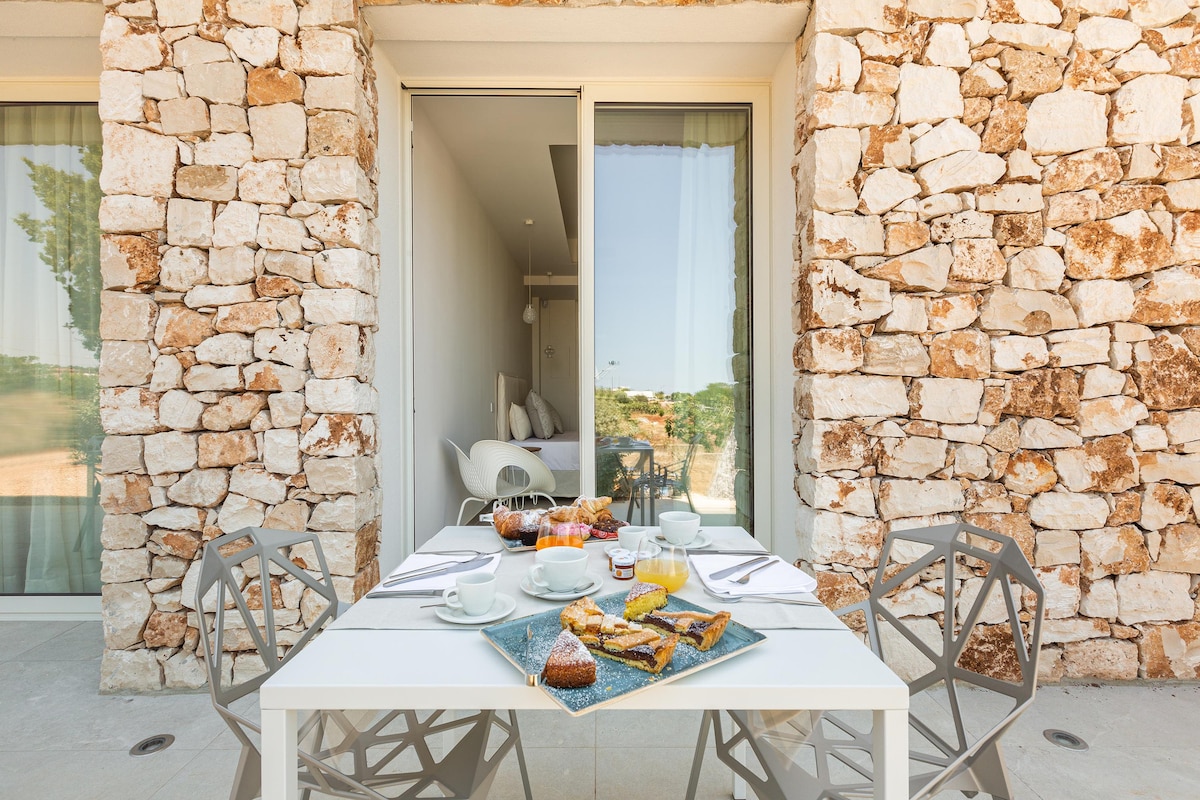 Passeggiando per le vie di un piccolo paesino, Sannicola, nel cuore del Salento, una scalinata di un palazzotto di fine '800 vi condurrà verso una dimora storica: Azalea Suite Deluxe è un’oasi di piacere per la coppia dai tenui colori pastello di giorno che si colora intensamente nelle ore più buie, per un’atmosfera intima e romantica. Vasca idromassaggio in marmo ad uso esclusivo nella suite privata. Seconda piscina a sfioro esterna, condivisa.
