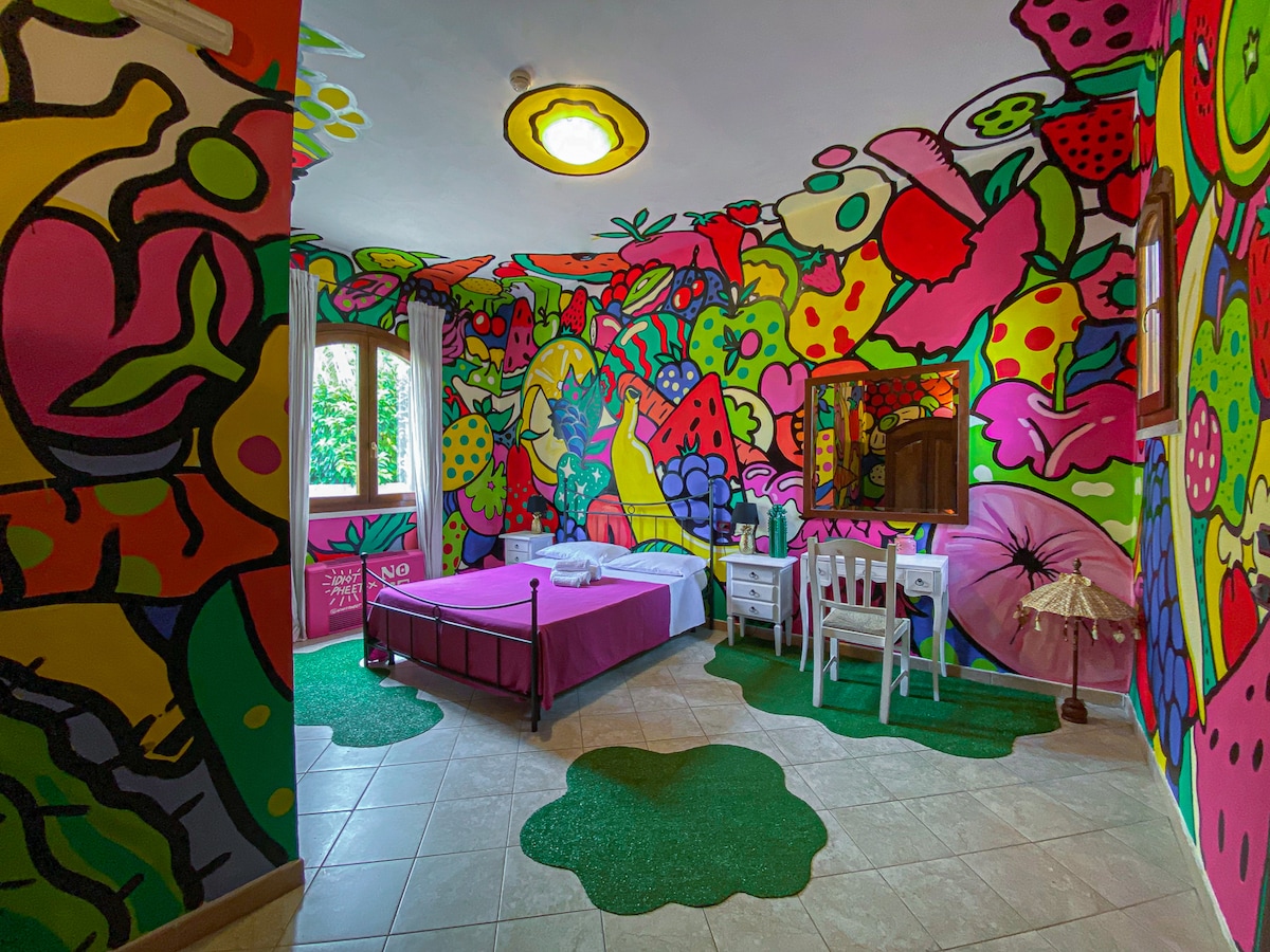 Located on the lower floor of the ancient tower, "Fiabe" presents itself in its uniqueness since the entrance: a first door with modern lines accompanies the entrance into an antechamber equipped with a comfortable sofa; a second door in antique wood opens onto the room, in a gradual and poetic transition from reality to a suffused atmosphere, where reverberations of light, curtains with the lightest fabrics and references to distant eras, accompany the guest into a unique, fairy-tale dimension.