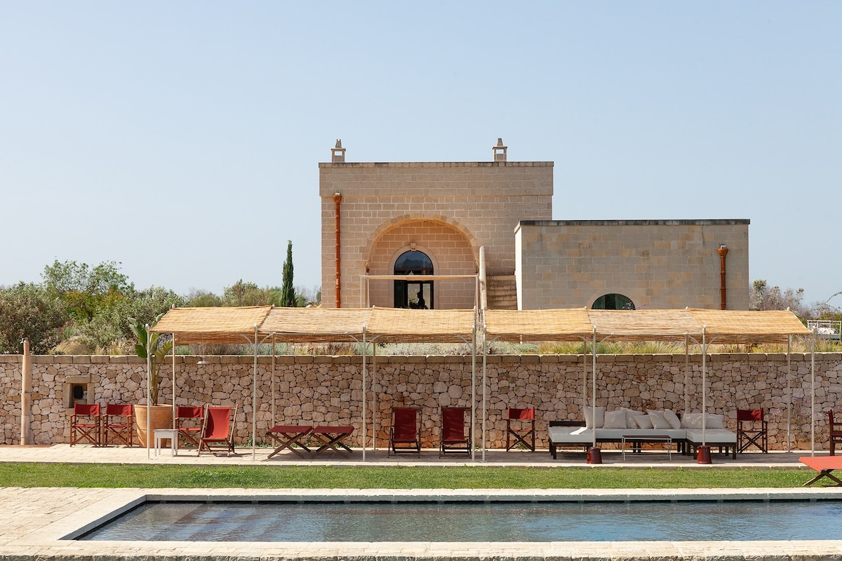 Masseria Li Cafari is a reimagined 16th-century estate in the protected countryside of Nardò, just 1.5 km from the sea. Surrounded by 3 hectares of private parkland—pine forest, 600-tree olive grove, orchard, and a 15m pool—the villa blends historic stone architecture with modern design. Guests enjoy a dramatic glass atrium, expansive living areas, panoramic sea views, and 8 luxurious suites with private gardens and outdoor showers.