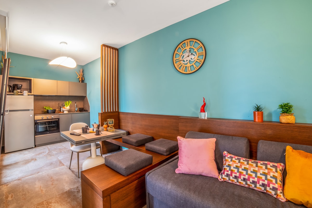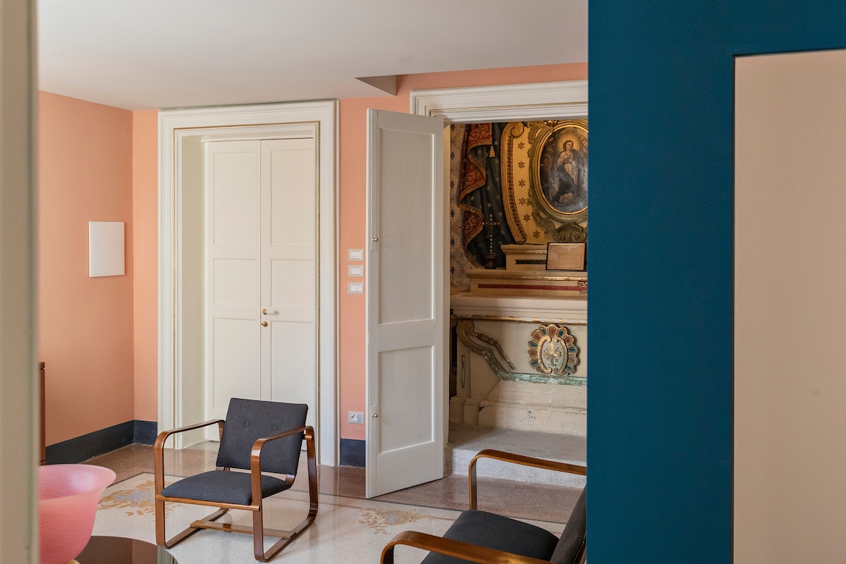 Angelica è un prestigioso appartamento di 100 mq all’interno di Distilia, una dimora salentina che Lilia e Lorenzo hanno reso un luogo speciale. La neoclassica sala degli specchi, con il pavimento in gettata di graniglia e il soffitto a botte decorati da corone d’alloro, ha conservato gli arredi originali. Le due stanze da letto, con bagno, sono arredate con icone del design novecentesco: come il letto di Osvaldo Borsani e il tavolo di Enzo Mari. La cucina ben attrezzata completa l’appartamento.