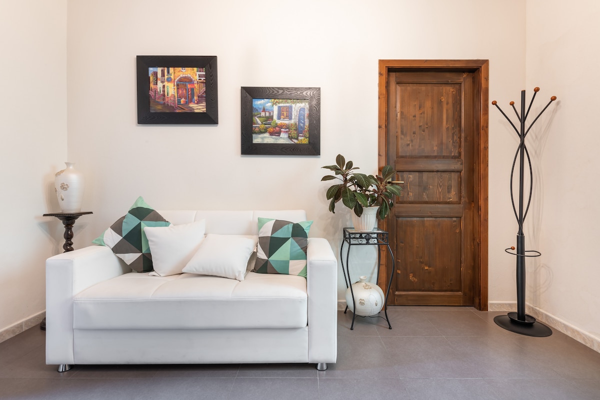 Un appartamento accogliente, luminoso, dotato di tutti i comfort. Aria condizionata, Smart Tv, un letto comodo e un divano letto, tostapane, macchina del caffè, frigo e forno a microonde, (non è consentito l’uso dei fornelli), wi-fi gratuito, parcheggio in loco e gratuito sono a vostra disposizione e vi aspettano per rendere il Vostro soggiorno ancora più confortevole. Dal soggiorno si accede alla terrazza dove potrete consumare la ricca colazione che vi aspetta al risveglio.