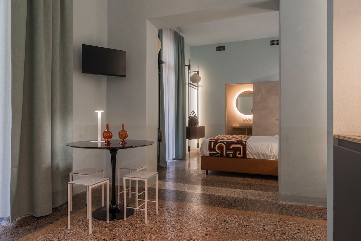 Suite 407 at Palazzo Archimede is a suite with a private terrace overlooking the internal courtyard: comfort and centrality with the added bonus of an outdoor space. The interior includes a fully equipped snack corner, a dining table and a double bed, organized to create a natural balance between living and sleeping areas. The space is bright, airy and cared for in every detail.