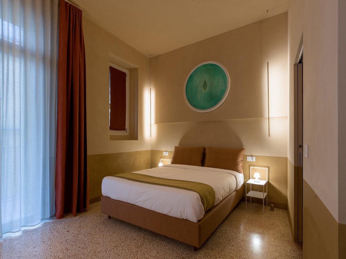 Studio 306 in Palazzo Archimede offers a private terrace in the historic center: a rare outdoor space in Bologna, perfect for an outdoor break after the city. The interior includes a picnic kitchen (kettle, mini-fridge, coffee machine) ideal for quick preparations, a dining table and a double bed, distributed with intelligence to maximize comfort and functionality. The space is easy to interpret and live in, perfect for a short vacation.