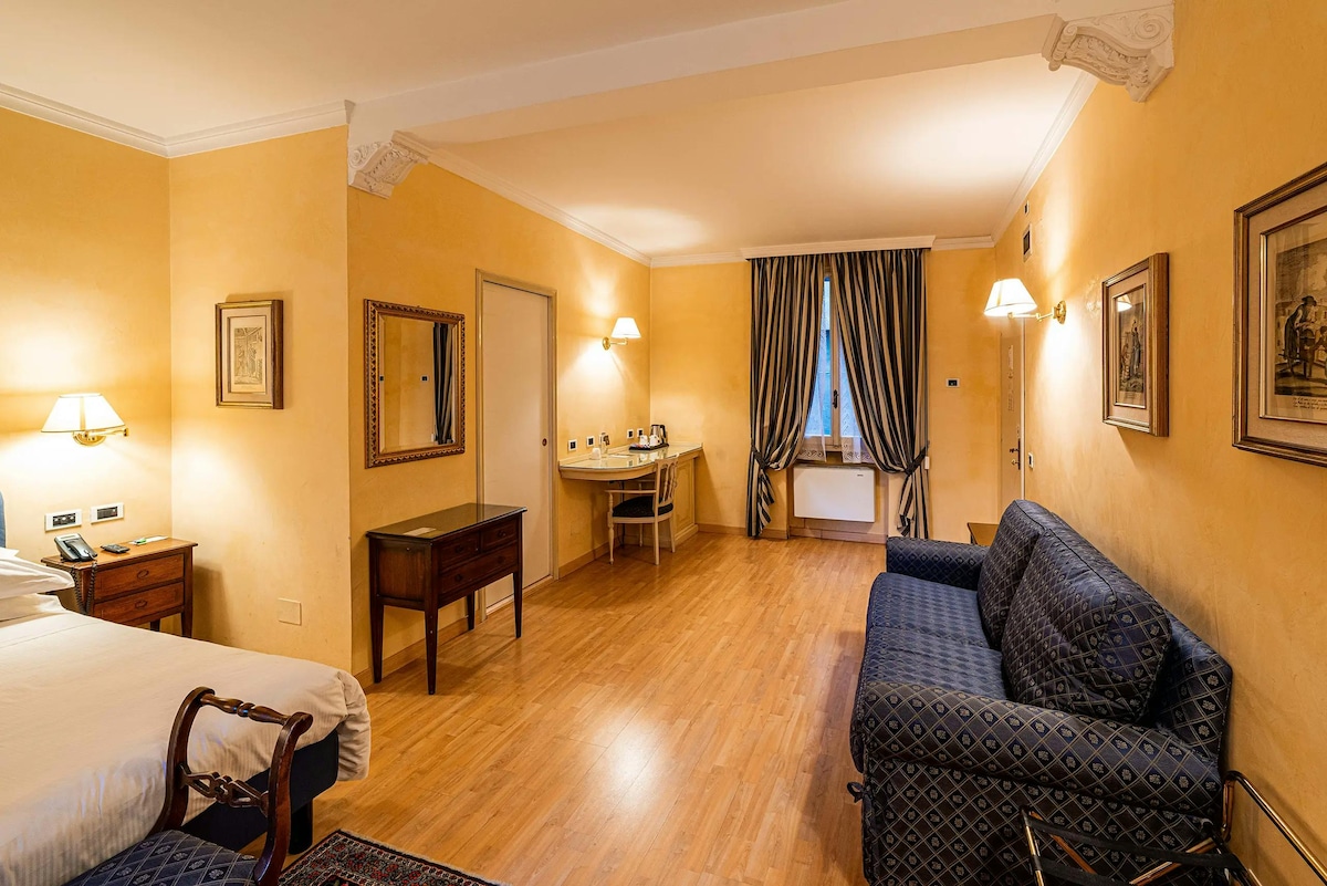Step into a Compact Room at Phi Hotel Canalgrande, where efficiency and style intertwine. Though modest in size, these rooms are designed with an eye for elegance. You’ll find all the essentials—climate control, a mini-fridge, a hairdryer, direct phone line, a safe, television, and Wi-Fi—neatly arranged to ensure your stay is both comfortable and practical. Enveloped in the refined ambiance of this historic palazzo, a Compact Room provides a cozy yet sophisticated retreat for one or two guests.