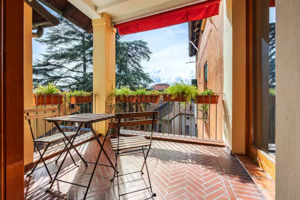 The apartment is situated on the top floor of an ancient building fitted with a glazed elevator in the heart of Medieval Bologna, right in front of the 17th-century Opera Theater. Cozy, panoramic and sunny, a quiet private loggia opens to the interior courtyards offering great views over rooftops, secular pine-trees, and the medieval Two Towers.