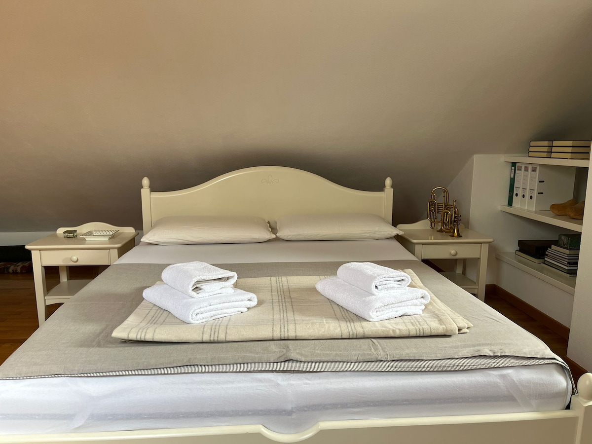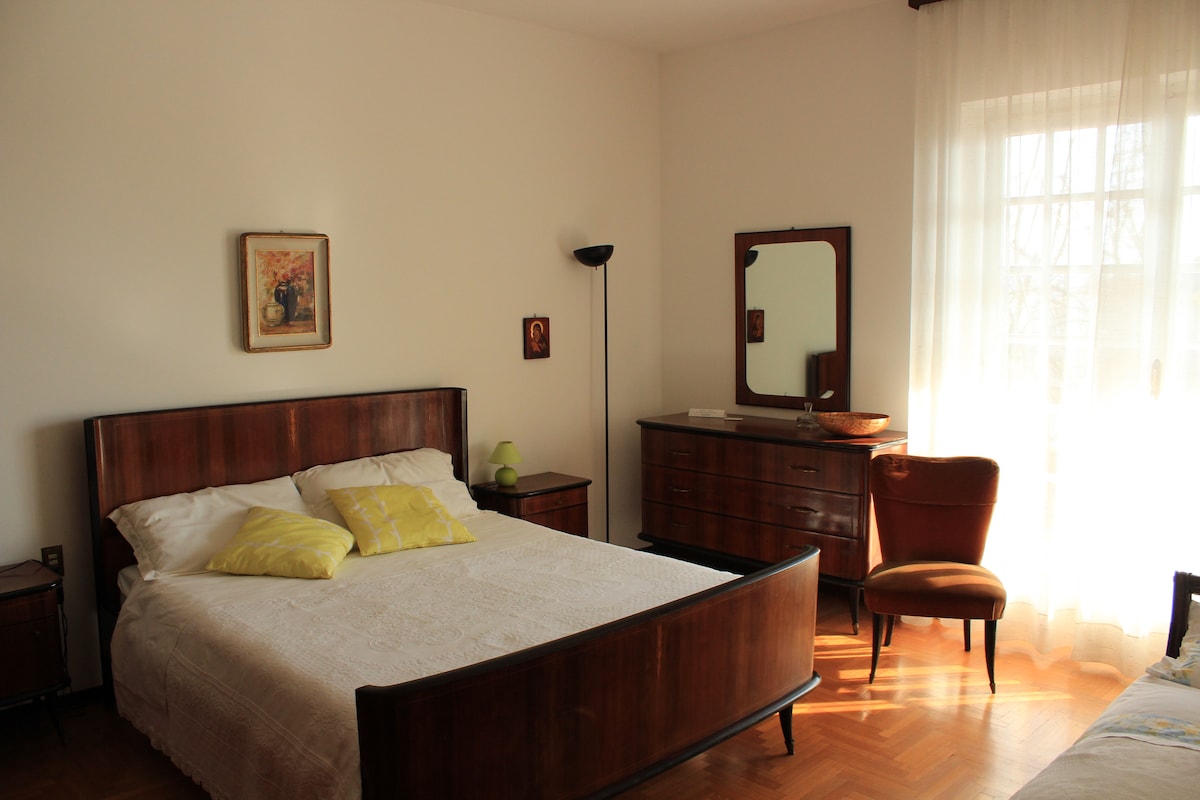 La Camera Est Giardino è un'ampia camera al primo piano della villetta in cui viviamo, dotata di un letto matrimoniale, un letto singolo e un secondo singolo estraibile. Il bagno, con doccia, è privato e interno alla camera.
