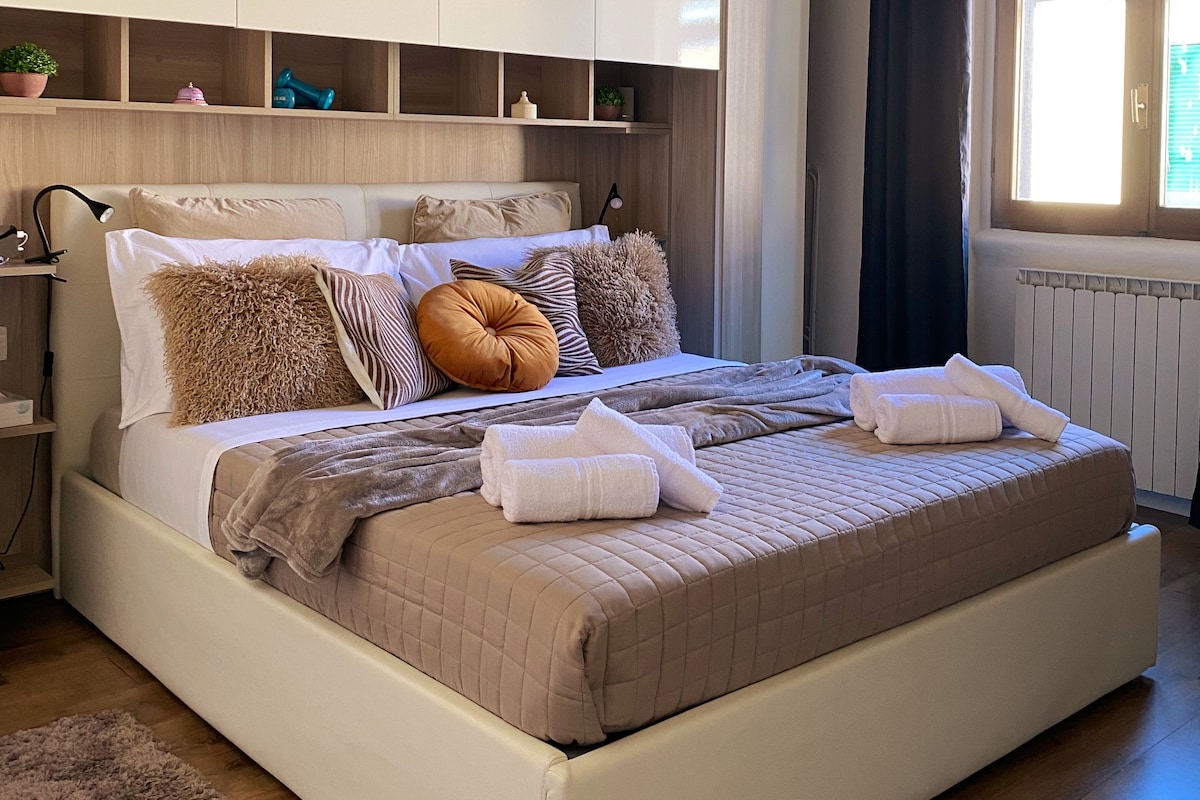 Questo elegante alloggio è perfetto per viaggi di lavoro, per coppie e famiglie. Ampio bilocale di 75mq al primo piano senza ascensore, completo di tutti i comfort. Salone accogliente con divano letto matrimoniale (materasso 17 cm), smart TV da 50" con pacchetto Sky/Netflix , connessione WiFi fibra. Cucina completa: piano induzione, frigorifero, forno, lavastoviglie, microonde, macchina del caffè e bollitore elettrico. Bagno completo con grande doccia, wc e bidet. Camera con cabina armadio.