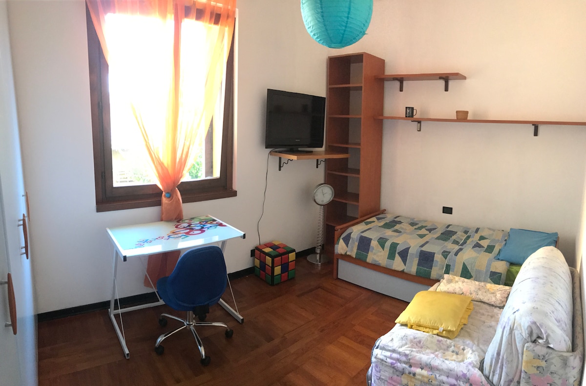 Large bright apartment located in the heart of the Groane Park, in the province of Monza and Brianza. The three-room apartment has a kitchen separate from the living room equipped with every comfort and utensil necessary to spend a relaxing time in the city of Milan. A large garden with dog fence is available for your pet's needs or simply to enjoy a breakfast or lunch in the sun on the patio. Full bathroom and an ante-bathroom with shower. On request the 7 bedroom