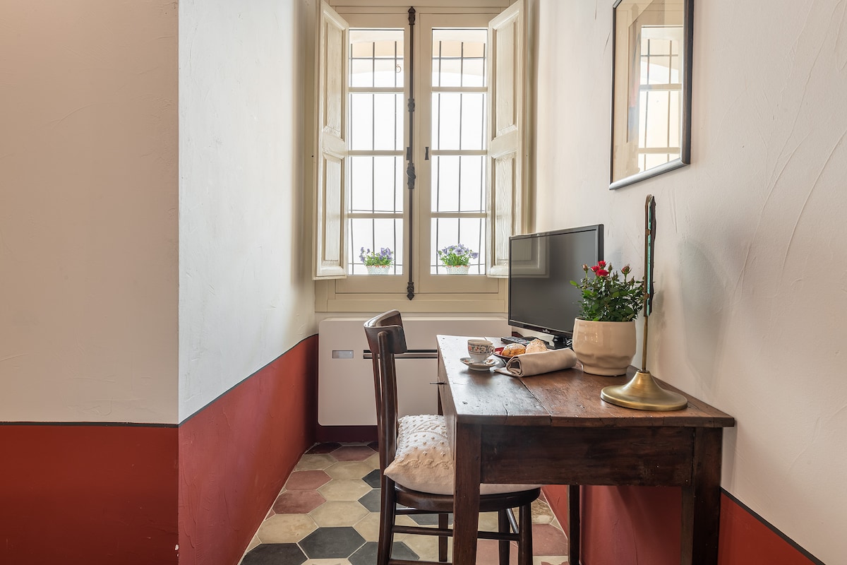 La camera Standard, arredata con mobili antichi, è caratterizzata da una volta a vela di mattoncini in cotto di fine '800 e pavimento in cementine impreziosito da decori geometrici. Con i suoi 16 mq, è accogliente e raccolta, munita di due letti singoli o matrimoniale all’occorrenza, scrivania e poltroncine. Dotata di tutti i comfort: TV a schermo piatto, Wi-Fi.