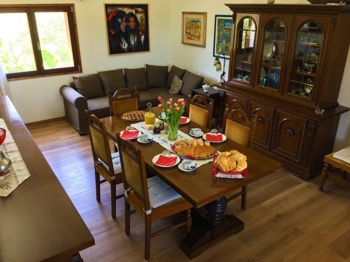 Very confortable 10 /12 beds apartment ,in a nice recently built house , situated in a great,quiet, safe location, sourrounded by Mediterranean vegetation , with garden,veranda with parlour lounge and beautiful sea view, Aircondition,free WI-FI, Perfect for relaxing holidays, close to the main climbing routes. perfect for big groups , up to 10/12 people .