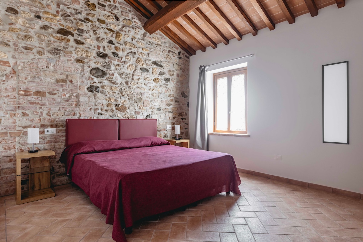 Bacco is a cozy apartment within the larger Fonte Sala estate. It features rooms of vaulted wood beam ceilings and trusses with the family’s antique furniture throughout. Relax around the fireplace and swim in the pool set among the olive trees.