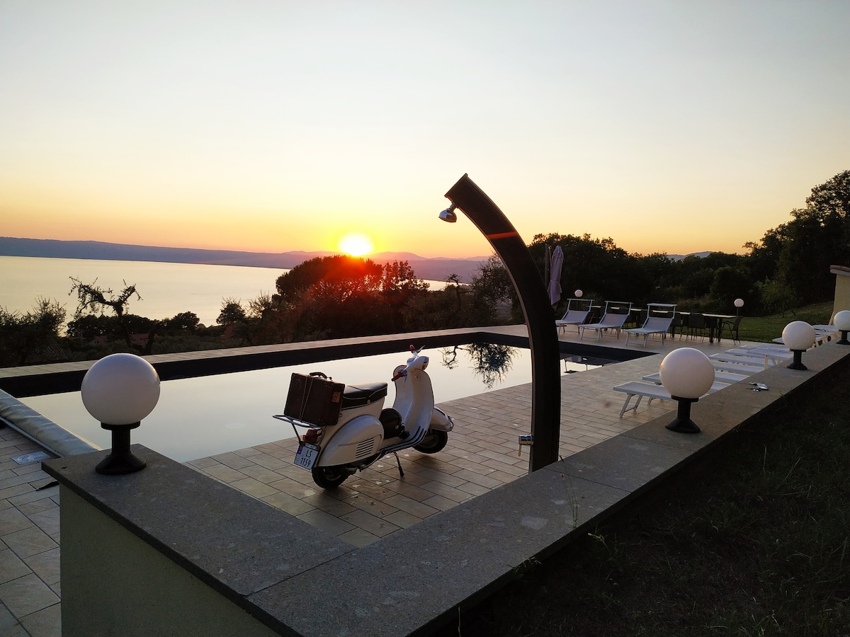 Villa Bianca Luna, located in the pretty village of San Feliciano, a few kilometers from Passignano sul Trasimeno and very close to Lake Trasimeno, will surprise you with romantic sunsets. A modern structure with attention to minor details, characterized by elegant interiors and modern comforts, it has a beautiful pool with a continuous waterfall that becomes one with the nearby Lake Trasimeno. CODICE CIN: IT054026B404019412