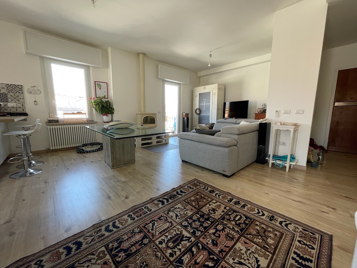 Incantevole appartamento al quarto piano fronte mare, da cui è possibile ammirare l'alba e raggiungere le spiagge di Fano semplicemente attraversando la strada. Ubicato in zona Sassonia, a 5 minuti a piedi dal centro storico e a 10 minuti a piedi dalla stazione. L'alloggio è composto da un grande soggiorno con cucina a vista, 2 camere da letto (1 con letto matrimoniale e 1 con divano letto), un bagno e un piccolo balcone molto panoramico. Circondato da ristoranti, supermercati e servizi