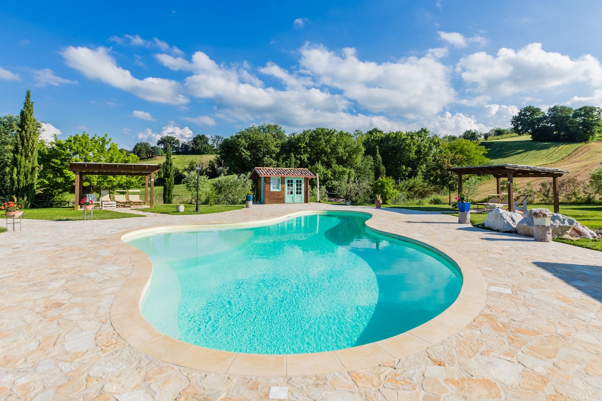Casa indipendente ecosostenibile immersa nelle verdi colline tra Emilia Romagna e Marche, dove poter trascorrere momenti indimenticabili. Ampi spazi interni, 5 camere ognuna con servizi privati, cucina attrezzata e sala da pranzo, salone dove condividere momenti in allegria. All'esterno troverete il porticato, con poltrone e divano, giardino e barbecue. La piscina, con idromassaggio, affaccia su una splendida vista panoramica. Un paesaggio unico, un territorio ricco di storia e tradizione.