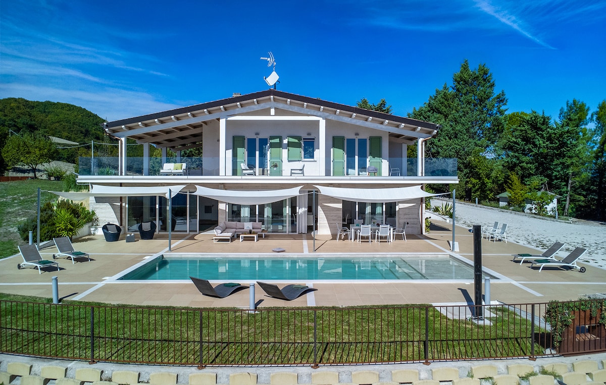 Villa Design is an elegant private villa with pool in Le Marche. The property is immersed in a green landscape in the town of Pergola which is only few km distant. The villa still preserves its antique rural architecture combined with a refined modern taste given by the large rooms and comfortable furniture. The property is entirely gated and completed by a large garden with salt water pool with Roman stairs and adjoining gazebo with panoramic view to relax.