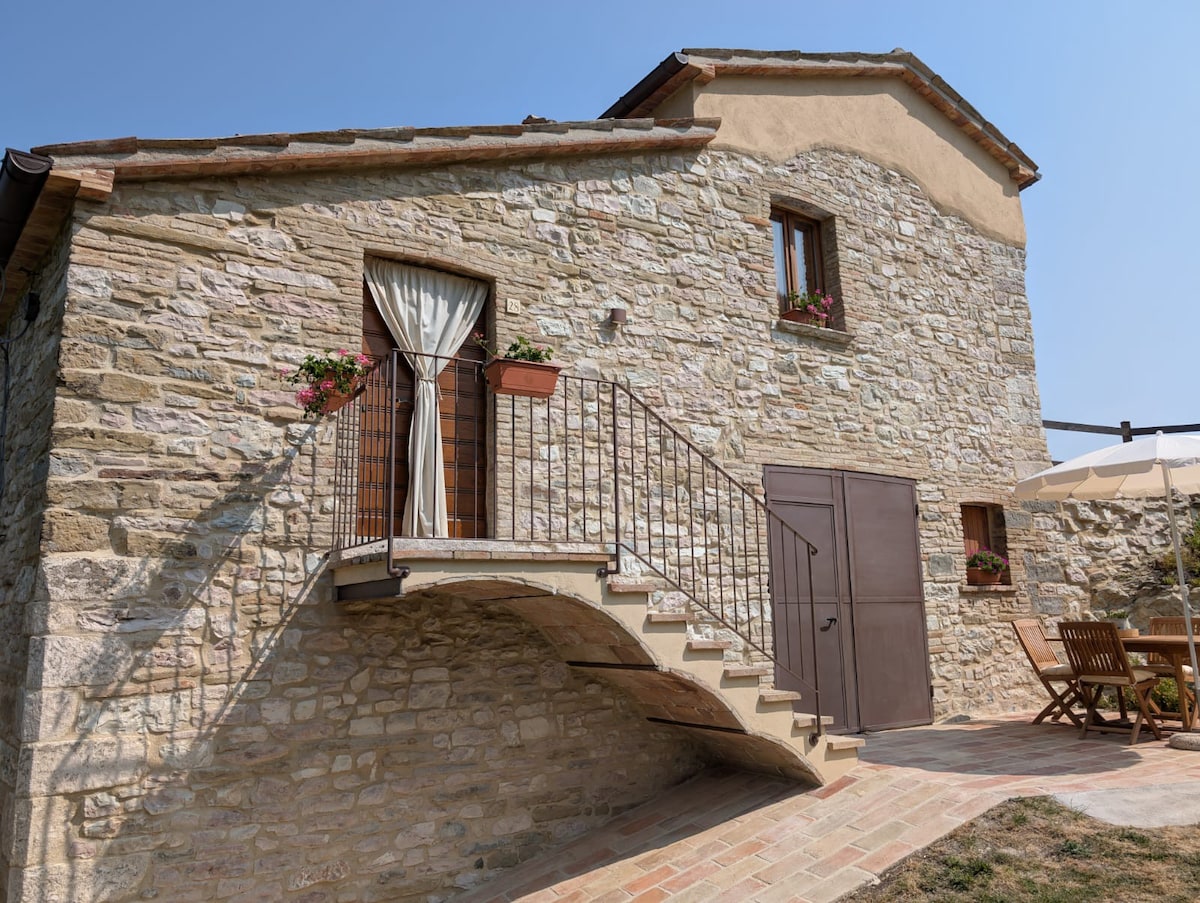 Peaceful apartment with terrace and beautiful mountain views San Cristoforo is a charming cottage in the Marche countryside. Beautiful views and lovely fresh air. Pretty terrace for out of doors dining and relaxing. Well furnished. Charming fireplace. Central heating. Quiet spot. Ideal for visitors to local attractions such as Urbino, Urbania, Gubbio, San Sepolcro, artists, families with children, walkers, lovers of the countryside and local gastronomy. Romantic views.