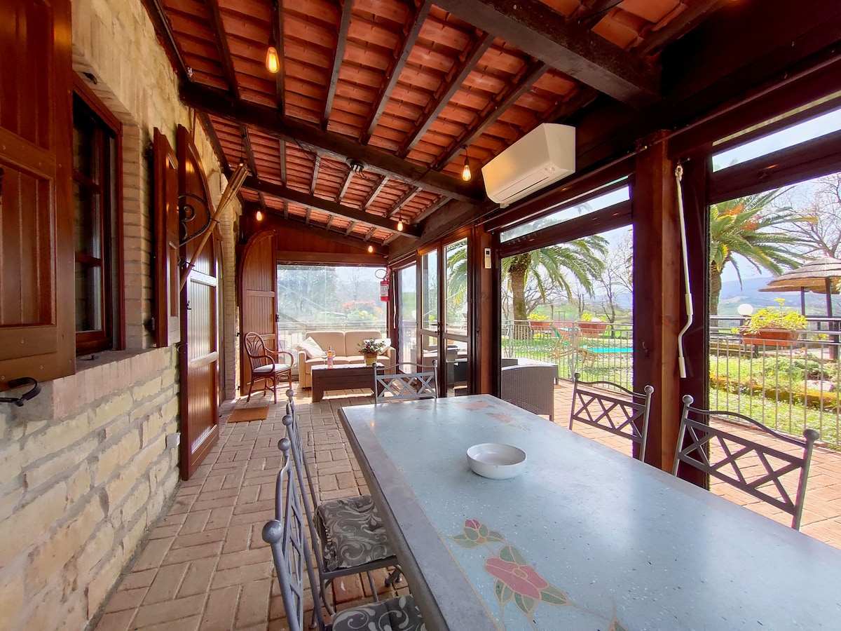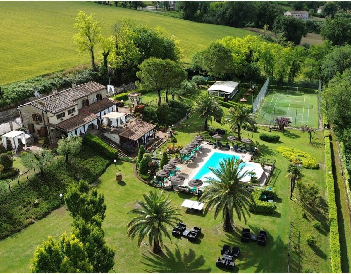 Villa Valle del Sole, 20 minutes from the sea of Fano and 30 minutes from Urbino, offers 5 suites with private bathroom and kitchenette, for a total of 13 beds. Private swimming pool with sun loungers, tennis court and gym equipped for every type of holiday. Private park with lounges under the Palms. 3 barbecues and large areas on the terrace, porch and veranda for moments of conviviality. Nature and relaxation between sea and history.