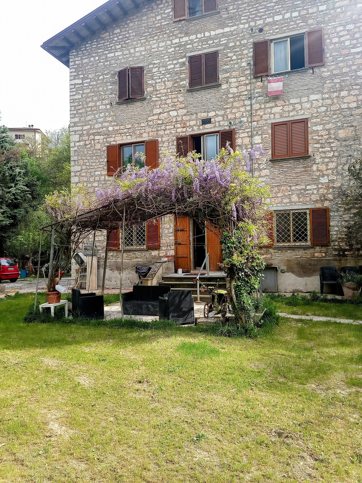 L'appartamento si trova a piano terra di una casa singola, a pochi metri dal lago di Mercatale ed è immersa nel verde, con un terreno di un ettaro, con ampio giardino piantumato (alberi da frutto) , fiori ed un bellissimo orto , i cui prodotti sono a disposizione degli ospiti. A poche centinaia di metri, la bellissima Rocca di Sassocorvaro con tutti i servizi commerciali. L'appartamento dispone di tre camere da letto, una cucina abitabile, un salone , una stanza guardaroba ed un bagno con doccia