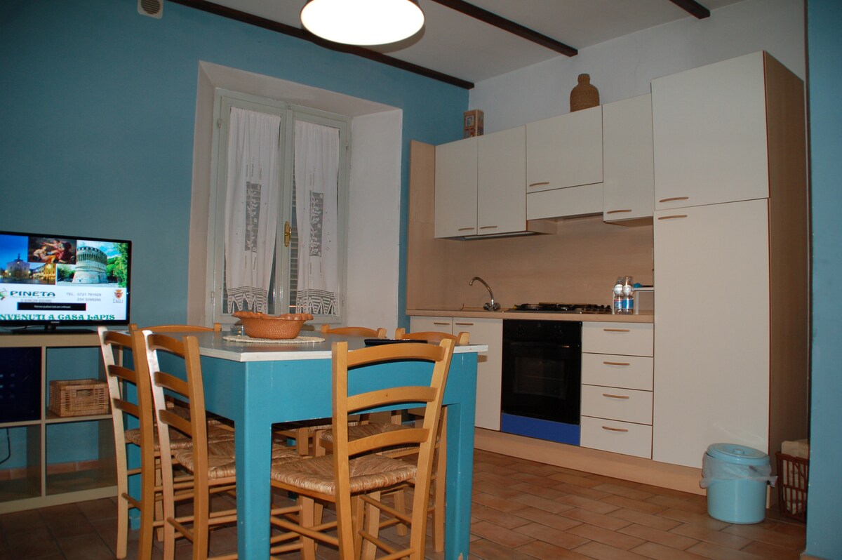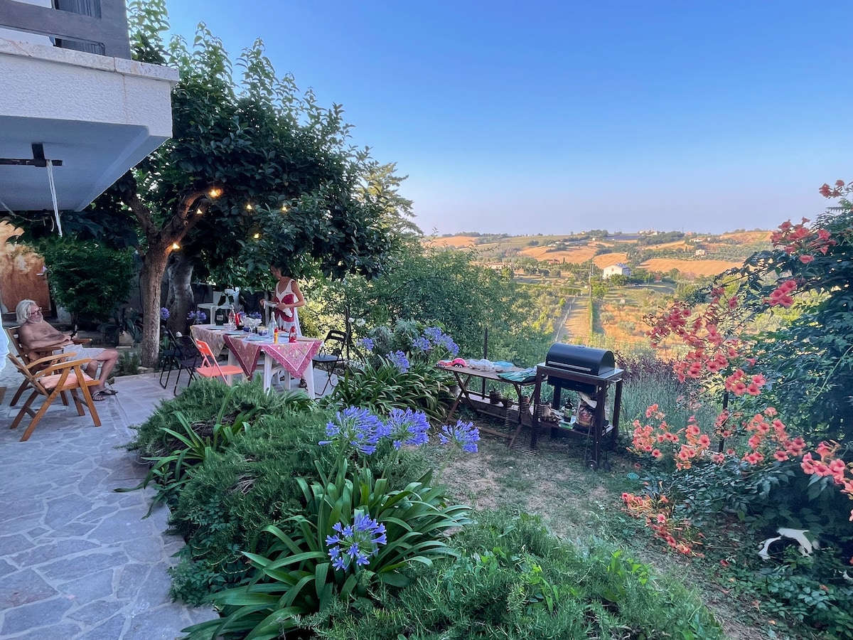 Independent holiday home with big garden located in the middle of the green San Bartolo Natural Park and looking at the blue of the Adriatic sea. The house is a welcoming and comfortable home of 100 square meters, perfect for people who love being in nature and relaxing looking at a spectacular view that goes from the Appennini mountains to the sea. The house, which have been recently refurbished, is close to the village of Casteldimezzo and the characteristic village of Fiorenzuola di Focara.