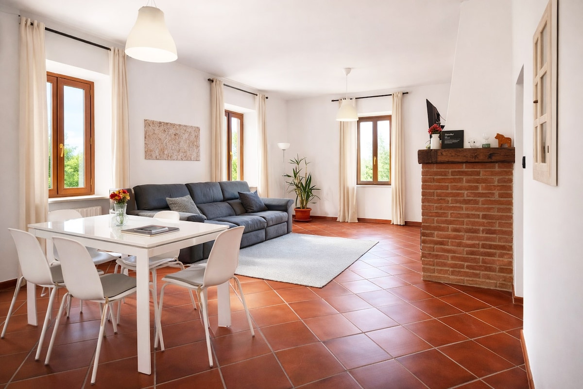Rustic and elegant, surrounded by nature. The Clubhouse of Podere Montevalle is a historic agricultural building, partly stone from the mid-19th century and partly brick from the early 20th century. Once the clubhouse of our equestrian center, it blends ancient charm with modern comfort. Completely renovated, it has a large double bedroom, a living room with a sofa bed, a bathroom, an entrance, and a spacious kitchen area. Ideal for relaxation, visiting art cities, and enjoying outdoor sports.