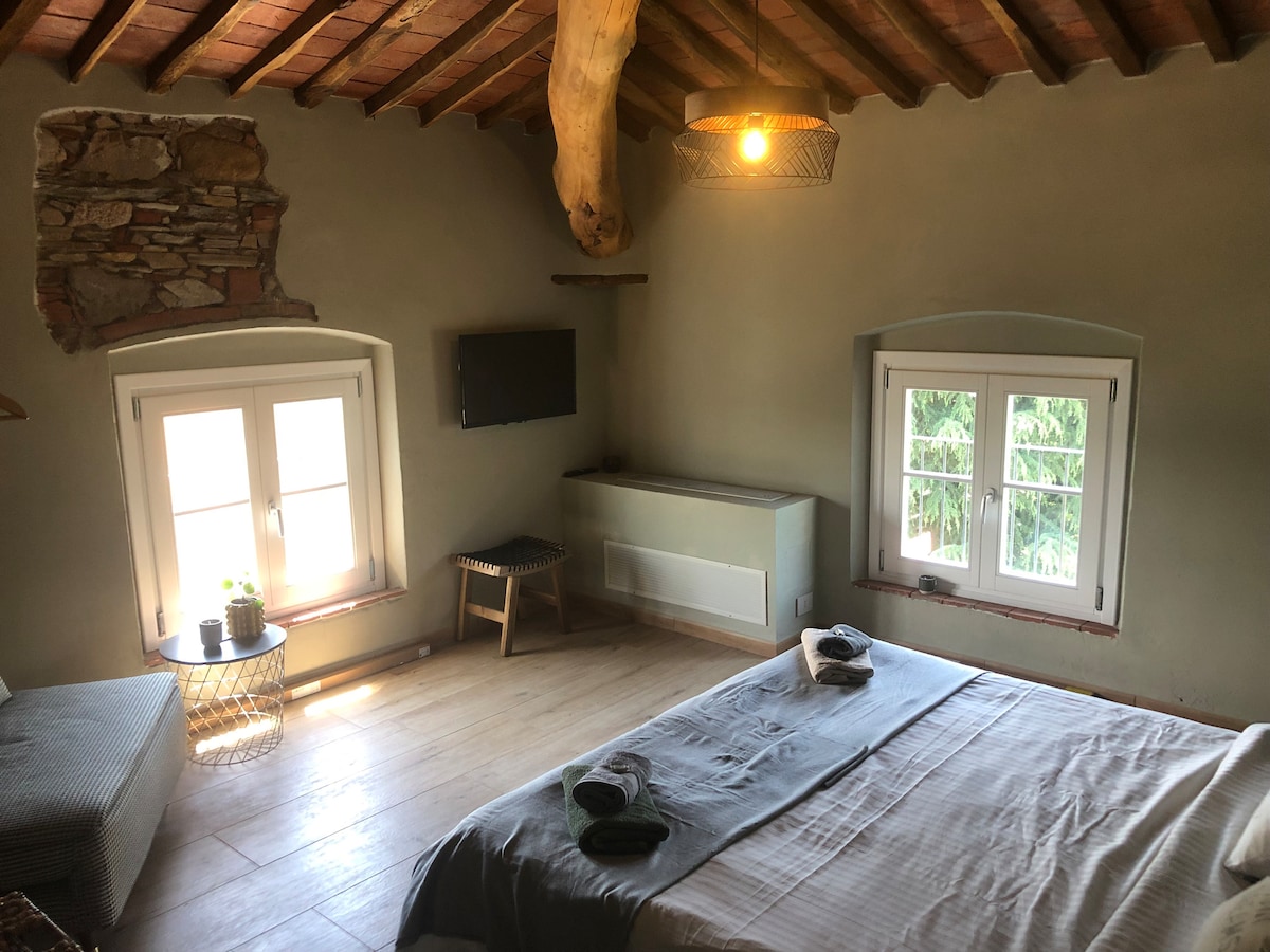 Away from it all in the peace and tranquility, yet 5 minutes from town. Escape the heat with the breeze in the hills and enjoy the nature in our beautiful rustic home. whole ground floor accommodation includes an enormous lounge area, well-equipped kitchenette, a family bedroom with bunk beds, and a further double bedroom. Beautiful lounge area with stunning views, and an ancient spring-fed swimming pool ( May-Oct) Pisa (+ airport) 15 mins Lucca 30 mins Florence 50 mins Train/bus 5 mins