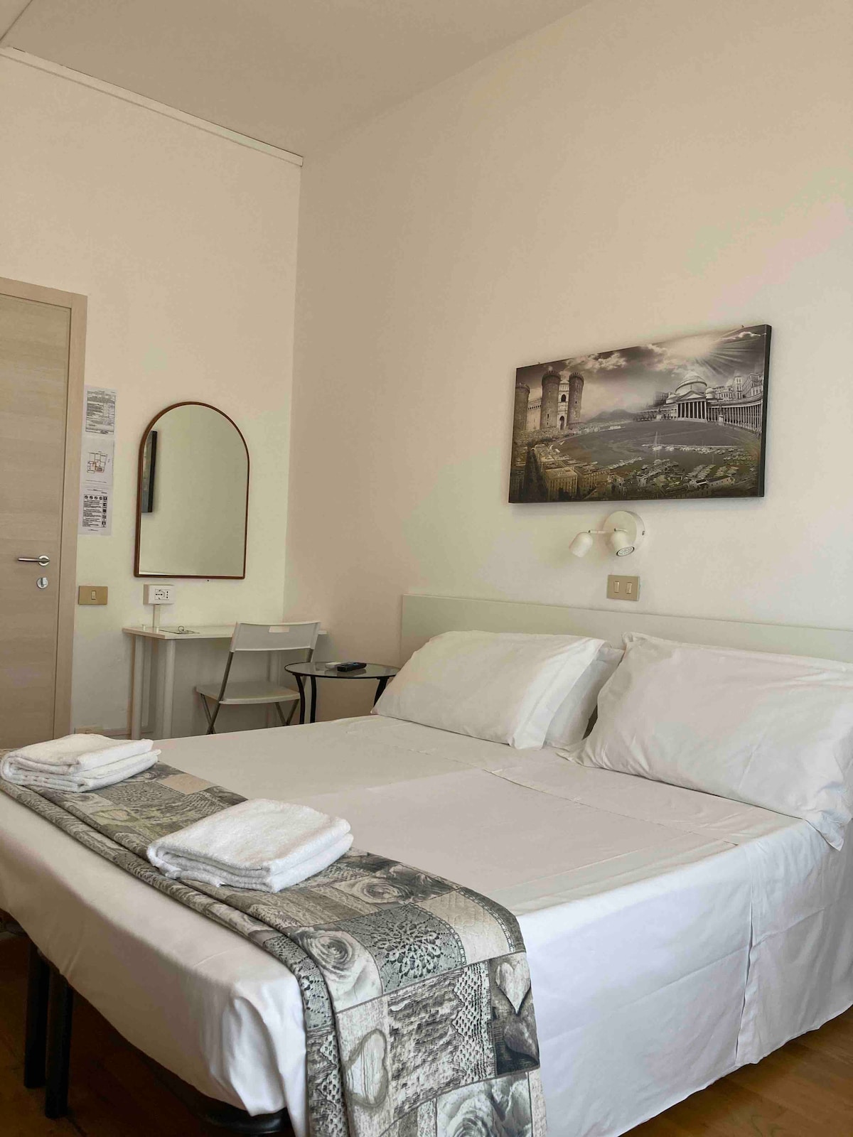 Hotel room with a double bed and two single beds, in Pisa city centre. Hotel Verdi also has a 24h bar, open to guests and outside customers.